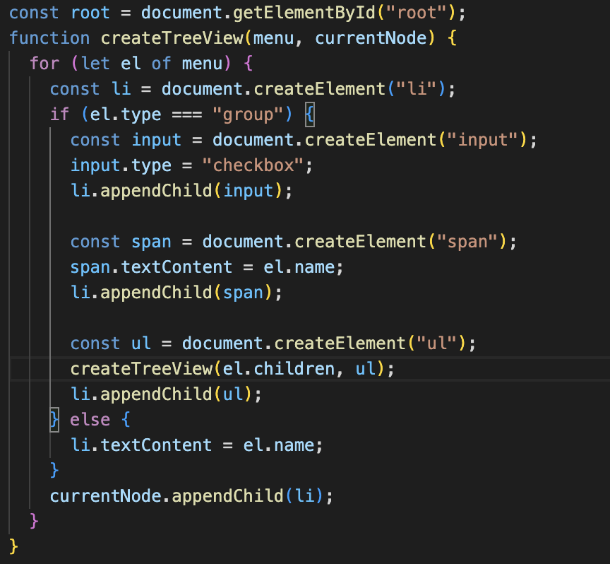 위의 그림처럼 ul 태그안에 자식요소와 자식요소를 가지는 자식요소들이 있는 Tree 구조를 위의 코드처럼 하드 코딩을 하는 것이 아니라 재귀함수를 구현하여 렌더링 하도록 하는 실습을 진행하였다.