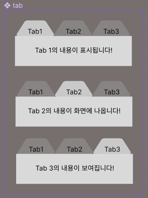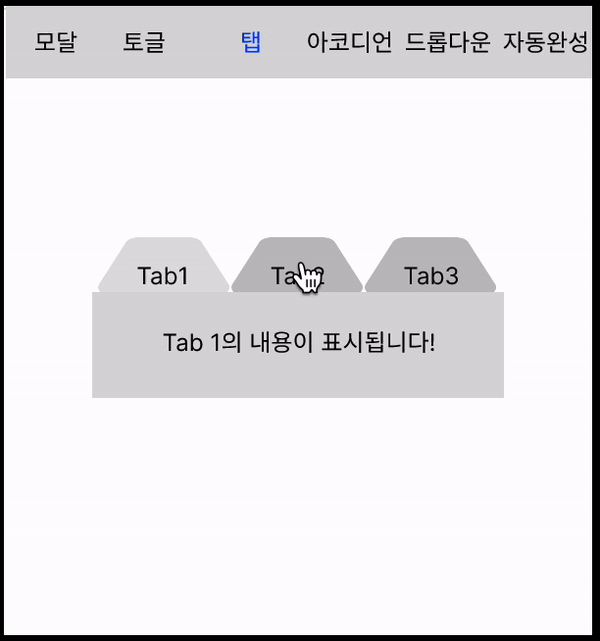 탭도 컴포넌트로 3개의 상태를 만들고 탭을 클릭하면 상태를 변경하도록 만들었다.
